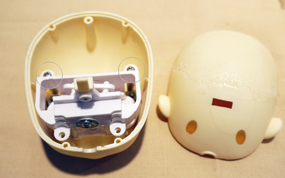 左の画像の様に、ギミック下×2、頭頂部付近×1、合計3個のねじで留められているので、プラスドライバーで全て外しましょう。